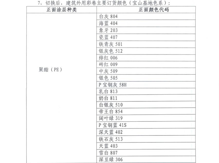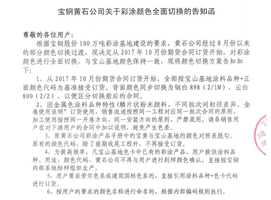 寶鋼黃石彩涂顏色全面切換告知函