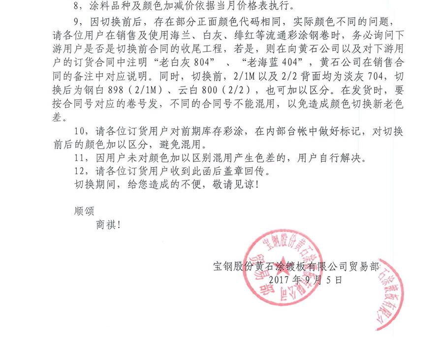 9月5日,寶鋼黃石發(fā)布了《寶鋼黃石公司關注彩涂顏色全面切換的告知函》,其告知函全文如下: