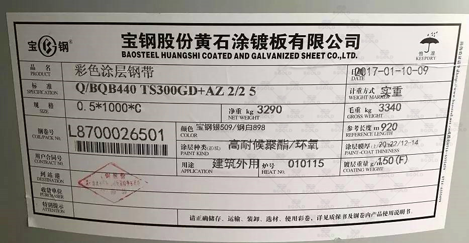 上海寶鋼彩涂卷噴碼為:BAOSTEEL+TDC51D+AZ/Z+涂層代碼+捆包號+合同號、且上海寶鋼彩鋼板自2017年起生產(chǎn)的彩涂板背面每隔2米均有二維碼噴碼可隨時(shí)掃碼防偽;