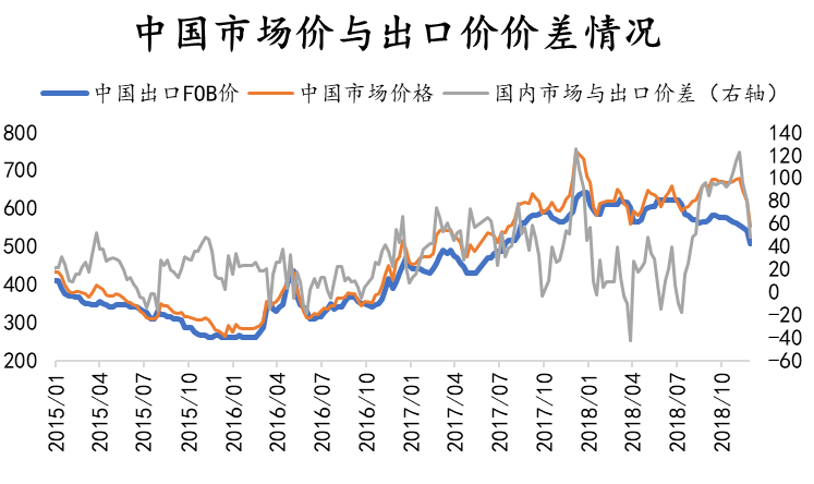 首先在11月下旬中國FOB價格出現(xiàn)大幅的下跌,鋼廠接受海外訂單量增加,并且11月中旬重點鋼企粗鋼日均產量195.15萬噸。11月中旬重點鋼企粗鋼日均產量195.15萬噸,旬環(huán)比增加3.51萬噸,增長1.83%。截至11月中旬末,重點鋼鐵企業(yè)鋼材庫存量為1327.11萬噸,旬環(huán)比增加104.23萬噸,上升8.52%。從鋼企日均產量可以看出,目前鋼材產量還是在不斷上升中,決定目前鋼市價格的還是下游的終端需求,但目前市場供大于求的狀況未有改變,并且國內貿易商冬儲意向并不明顯,且部分地區(qū)出現(xiàn)停工現(xiàn)象,導致鋼廠出口意愿增加。另外中美貿易戰(zhàn)進入90天“停火期”,這也利好鋼材的出口增加。綜合來看,12月份出口量或接近600萬噸,同環(huán)比均會有所上漲。